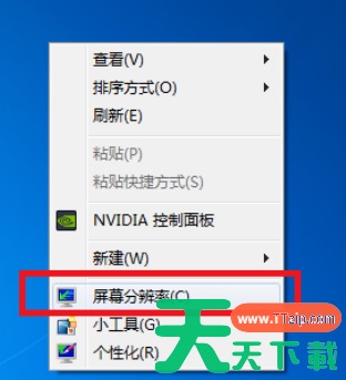 1、进入win7系统桌面,鼠标右击空白处,选择【屏幕分辨率】。