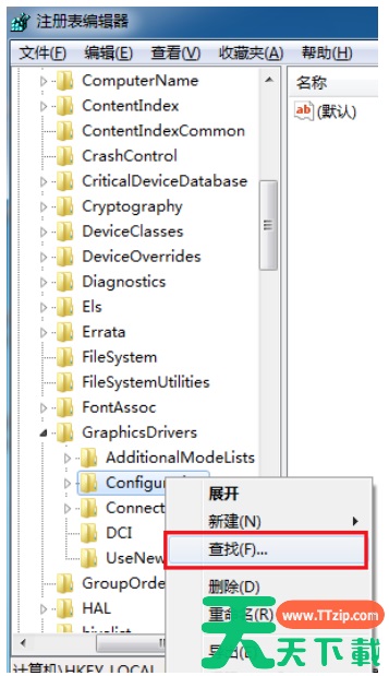 2、依次展开【HEKY_LOCAL_MACHINE】【SYSTEM】【ControlSet001】【Control】【GraphicsDrevers】【configuration】,在【configuration】上右击选择【查找】,输入【scaling】,点击【查找下一个】。