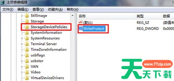 2、在打开的注册表编辑器窗口中依次展开“HKEY_LOCAL_MACHINESYSTEMCurrentControlSetControlStorageDevicePolicies”并找到StorageDevicePolicies右侧的WriteProtect键值;