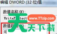 3、然后双击鼠标左键“WriteProtect”键,在弹出的窗口中将,数值数据设置为“0”,然后点击“确定”按钮。