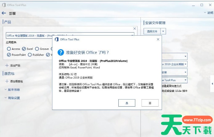 2、打开之后,我们选择Office专业增强版2019-批量版,然后勾选你要安装的组件,天天下载Ttzip只选择安装三套件,右侧安装方式选择在线安装、安装模块默认Office tool plus。点击开始部署;(注,通道选择半年通道即可)。