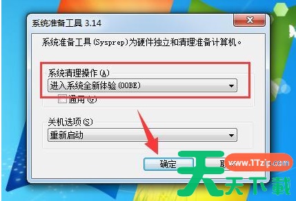 3、出现系统准备工具,选择“进入系统全新体验”,下方的关机选项选择“重新启动”,点击确定。