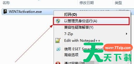 2、进入解压文件夹,右击Win7activation.exe文件,选择“以管理员身份运行”