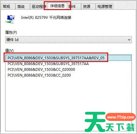 2。找到详细信息,然后在“属性”选项中选择“硬件ID”选项;如图所示: