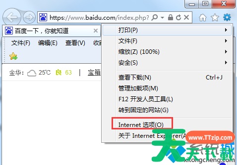 1、打开ie9浏览器,然后点击菜单栏上的 工具——internet选项,或点击右上角的齿轮图标也一样;