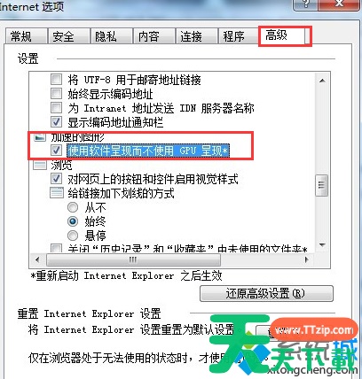 2、打开internet选项后,点击高级标签,进入到高级设置,然后找到“使用软件呈现而不使用GPU呈现”并勾选;