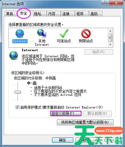 2、在弹出的框中选择“安全”栏,选择下方的“自定义级别”;