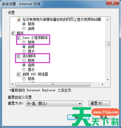 3、在弹出的框中,下拉,找到脚本下的“JAVA小程序脚本”与“活动脚本”,选择两者下方的“禁用”,最后点击下方的“确定”,就好了。