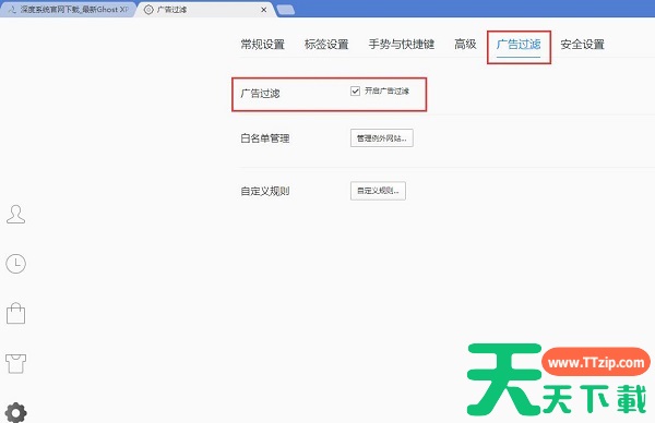 3、弹出的设置界面其换到“广告过滤”,勾选“开启广告过滤”即可。