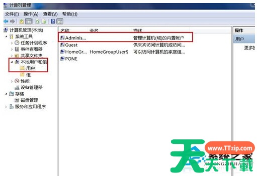 2、打开界面后,选择本地用户和组,单击用户,选择administrator账户即可。