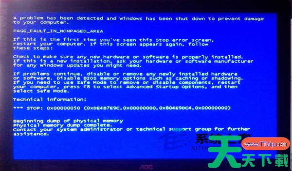 用户在使用Win7系统时,或多或少都会出现这样那样的问题。蓝屏,这问题是蛮常见的,0x00000050错误代码最可能的原因就是电脑内存的故障,这其中包括物理内存。二级缓存和显卡显存。当然还有其他原因比如软件的不兼容性、病毒破坏了NTFS卷的原因等等,具体和天天下载Ttzip一起来看看。