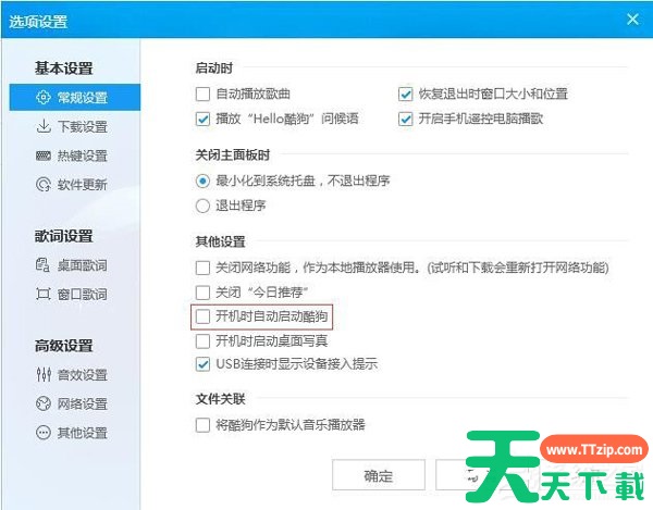 大多数软件都提供开机自启动的功能,以酷狗音乐为例,在设置中找到“开机时自动启动酷狗”,勾上前面的勾即可实现开机自动启动,如下图所示: