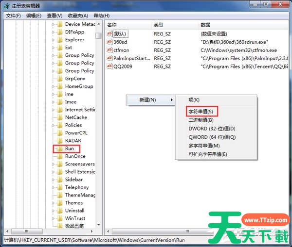 2、确定后,找到“HKEY_CURRENT_USERSoftwareMicrosoft Windows CurrentVersion Run”,右键选择“新建”下面的“字符串值”: