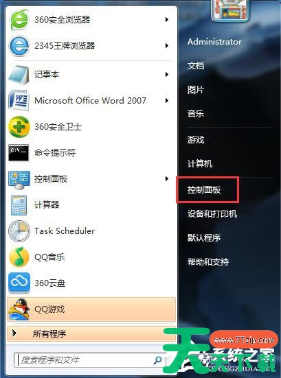 1、点击电脑左下角的开始图标,然后在打开的开始菜单中选择“控制面板”,打开控制面板程序。