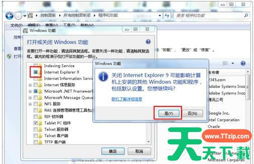 5、点击IE9前面的勾选,去掉勾选,点击后会弹出如下所示的提示框,其实并没有这个警告信息说的那么严重,只要我们安装了别的浏览器,就可以不用IE浏览器了,所以就直接点击对话框上面点按钮“是”。