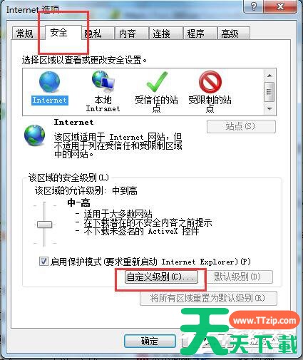 2、进入Internet选项 窗口之后,选择“安全窗口”,并点击“自定义级别”。