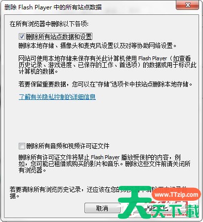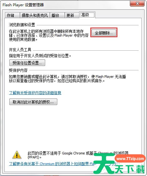 2、在flash Player 设置管理器中,选择“高级”下的“全部删除”;