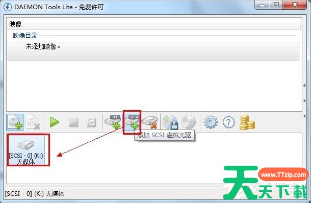 运行“精灵虚拟光驱”程序,在打开的主界面中点击“添加SCSI虚拟光驱”按钮,即可在窗口下方成功添加一个虚拟光驱。同时也会在“我的电脑”面板中发现生成了一个新的光驱盘符。