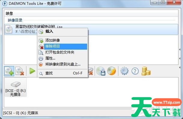 无论对于新添加的虚拟光驱还是映像文件,我们都可以通过右击选择“删除”操作来进行删除。