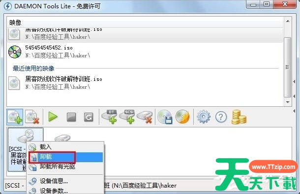 右击要挂载的虚拟光驱,在弹出的菜单中选择“卸载”项即可。