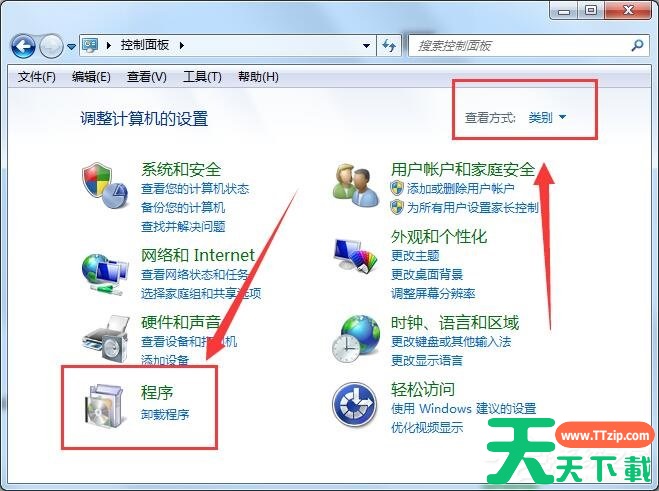 2、进入控制面板后,首先将“查看方式”选择为“类别”,以缩小图标查找的范围,然后点击“程序”。