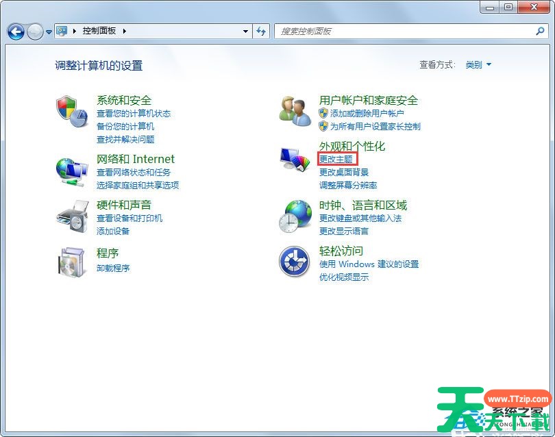 1、在控制面板上的外观和个性化中,选择更改主题;