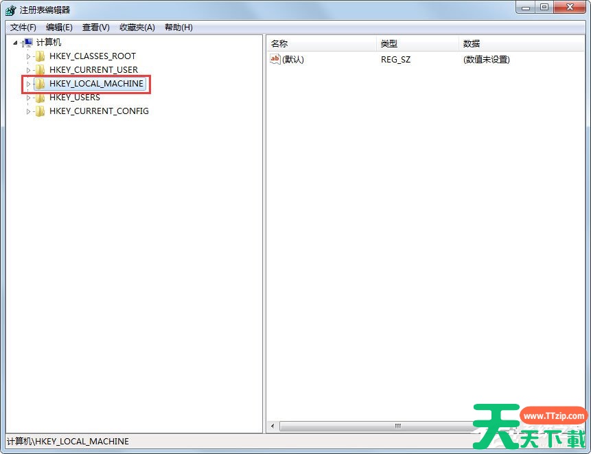 3、进入注册表编辑器后,先在左侧根键中,选择“HKEY_LOCAL_MACHINE”这一项根键;