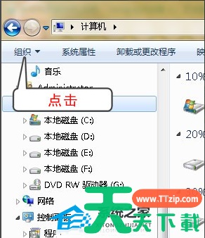 2、接在点击界面左上角的组织按钮,选择选择“文件夹及搜索选项”打开。