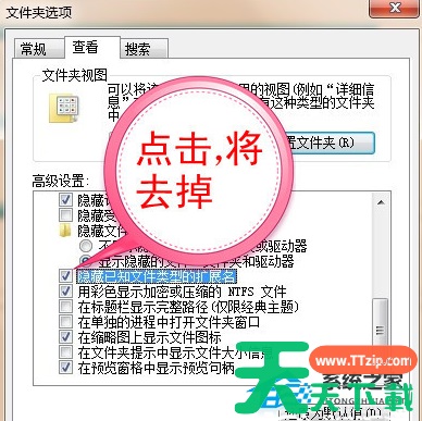 4、通过鼠标拉动滚动条找到“隐藏已知文件类型的扩展名”,然后将前面的勾去除,点击确定按钮即可。