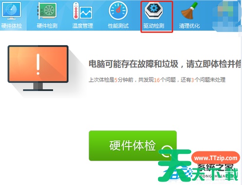 2、点击如图所示界面上方红色框内的“驱动检测”。