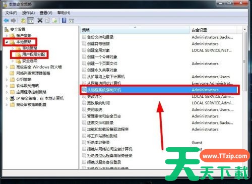 2、依次点击“本地策略——用户权限分配——从远程系统强制关机”选项。