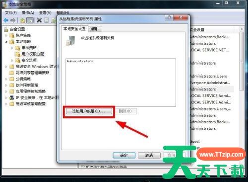 3、在强制关机属性界面,点击“添加用户或组”。
