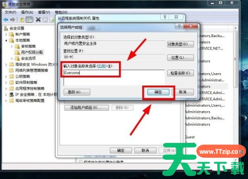 4、在用户和组界面,输入你要添加用户或组的名称,这里以“Everyone”为例,点击“确定”,确定完成后,关闭窗口。
