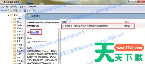 7、在关机选项里,双击关闭会阻止或取消关机的应用程序的自动终止功能,然后点击编辑策略。