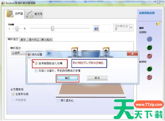 4、将【禁用前面面板插孔检测】前打勾,点击确定,这样消失的声音就回来了。
