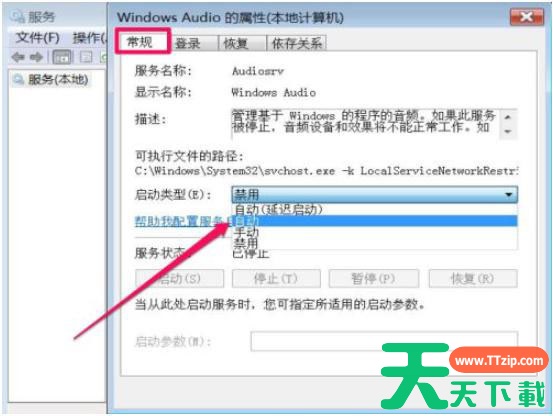 3、在音频属性窗口,选择“常规”选项卡,在其界面中,找到启动类型这一项,将其改为“自动”。