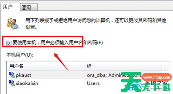 3、在打开的界面里,先点击选中你要登录的账户,然后把“要使用本机,用户必须输入用户名及密码”这句话前面的勾给去掉。