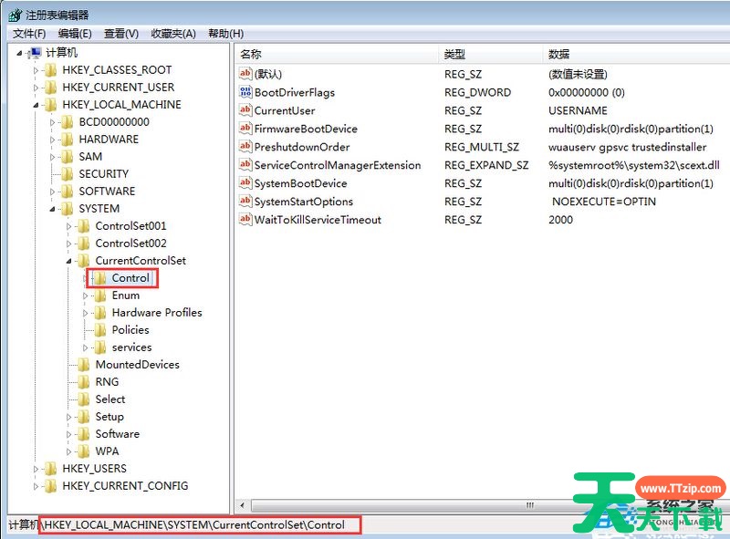 3、在注册表编辑器中,依次展开HKEY_LOCAL_MECHINE--SYSTEM--CurrentControlSet --Control。