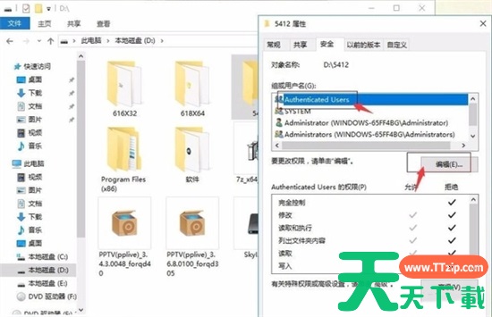 3、接着我们看到组或用户名的下拉列表内,我们选择Authenticated Users选项,然后点击编辑。