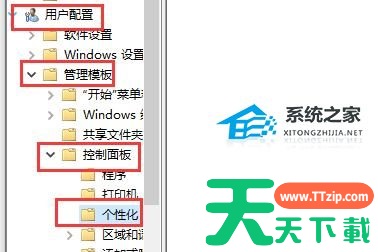 3、然后在左边依次进入“用户配置”-“管理模板”-“控制面板”-“个性化”。