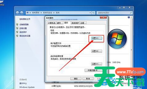 3、在系统属性页面中,切换至“高级”选项卡,并点击“性能”中的“设置”。