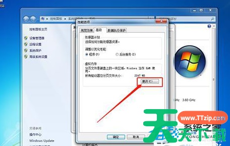 4、进入性能选项页面后,同样切换至“高级”选项卡,并点击“更改”。