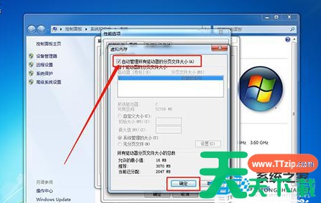 5、随后,勾选“自动管理驱动器的分页文件大小”并点击“确定”。