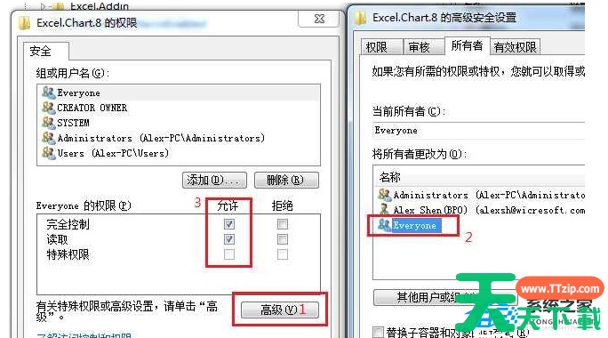 3、点击“高级”-“所有者”,选中“Everyone”,并勾选“替换子容器和对象的所有者”,然后点击应用,并将Everyone的权限未完全控制。
