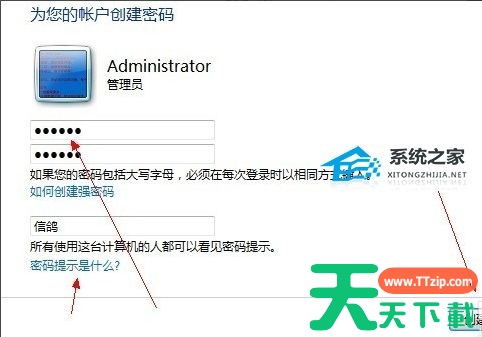 4、在设置密码的输入框中输入您需要的开机密码,然后设置密码提示,点击“创建密码”即可。