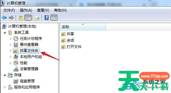 1、打开电脑,在桌面上使用鼠标右击【我的电脑/计算机】,弹出菜单,选择【管理】,进入窗口,在左侧栏点击【系统工具】——【共享文件夹】。