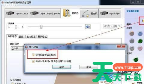打开音频管理器-点击右侧插孔设置-勾选禁用前面板插孔检测-点击确定即可。