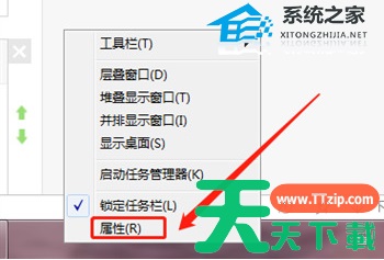 2、在电脑桌面下方的任务栏空白处,单击鼠标右键,会出现如下窗口,在窗口中找到“属性”并打开。
