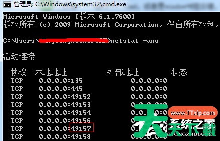 2、输入命令:netstat -ano,列出所有端口的情况。在列表中我们观察被占用的端口,比如是49157,首先找到它。