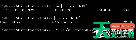 8、结束该进程:在任务管理器中选中该进程点击“结束进程”按钮,或者是在cmd的命令窗口中输入:taskkill /f /t /im Tencentdl.exe。